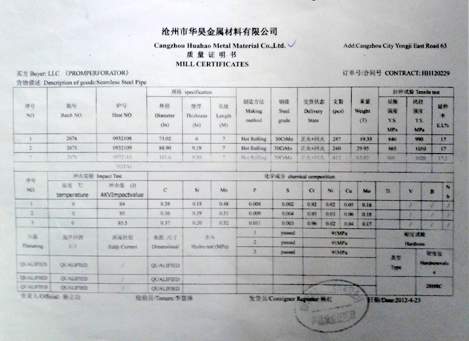 * Химический состав стали соответствует марке 35ХМ. (Приложение1), механические свойства соответствуют прочности «М» (Приложение 2), длина трубы 7 м. * Данная Продукция находится на складе ООО «Промперфоратор» в г. Уфа * Труба приобретена у производителя напрямую из Китая. (Приложение 3)